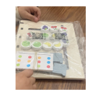 Es un tablero de madera 🧮 con piezas de colores 🟢🟡🔴🔵en una cara y frutas🍇 🍉🍌en la otra cara.